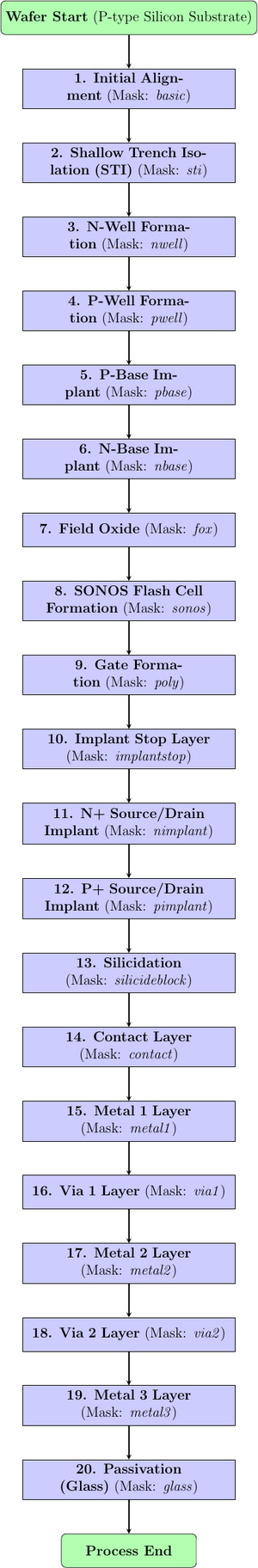 The overall manufacturing process is a sequence of layering, patterning, and doping steps. Below is the flowchart.