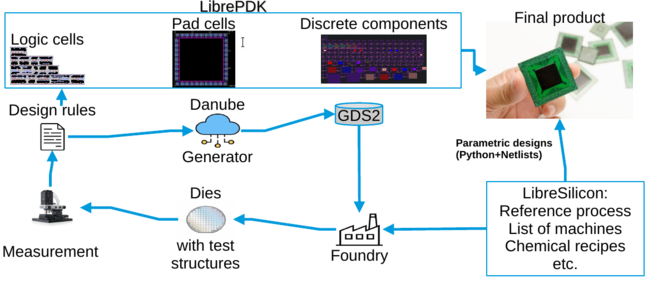For doing anything useful with your foundry, you need a way of verifying your setup, for which we provide you the test wafer generator Danube River, then you need standard logic cells for synthesizing, placing and routing your layout, and of pad cells so that you can wire bond your chip;